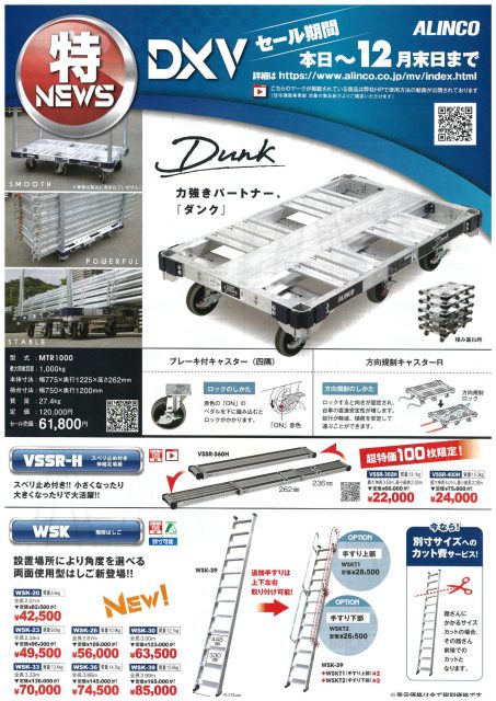 六輪仕様の台車「ダンク」や、はしご兼用脚立、作業台など特価にて提供中です。 一部商品にはご購入プレゼント品があります。