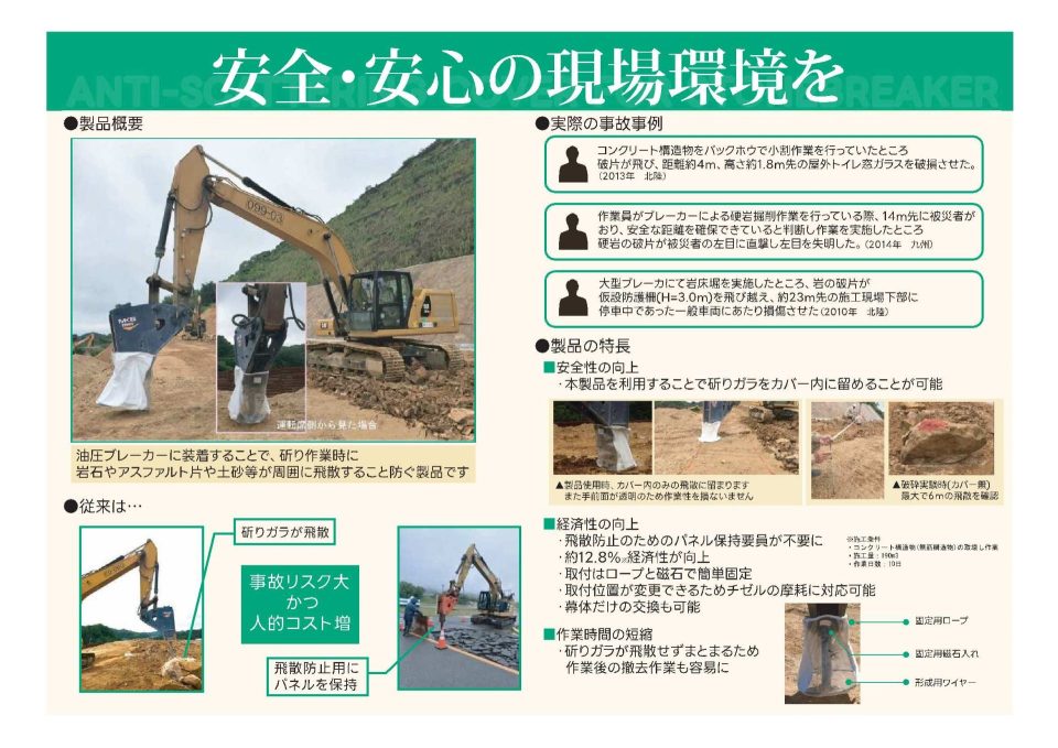 建設機械の油圧ブレーカーに装着することで、斫り作業時に岩石、アスファルト片、土砂などが 周囲に飛散することを防ぐカバーです。事故リスクと人的コストに貢献します。 NETIS登録商品です。
